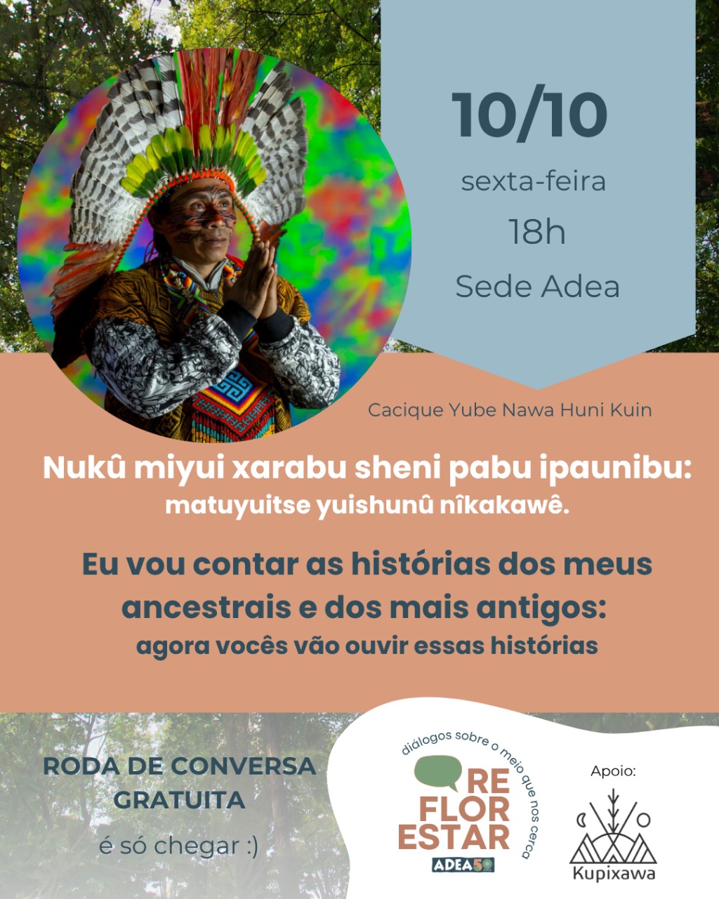 Acontece neste 10 de outubro, às 18h, na sede da ADEA, na Riviera Santa Maria, uma roda de conversa com Yube Nawa. Cacique do povo Huni Kuin, ele vem da Aldeia Nova Aliança, às margens do Rio Breu, divisa entre Brasil e Peru, no coração da Floresta Amazônica. Uma rara oportunidade para conhecer um representante dos povos originários e se inspirar com a relação deles com a Natureza. Evento gratuito!