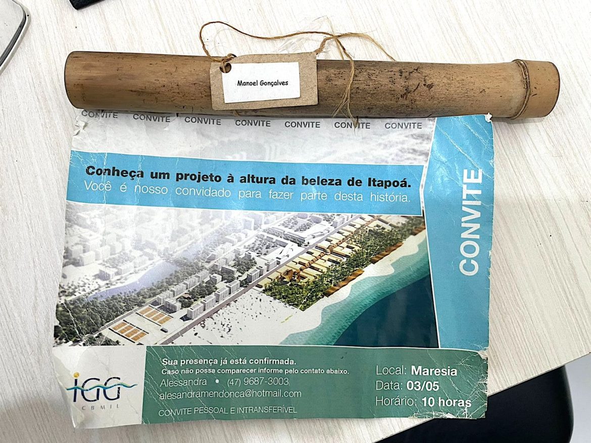 Manoel Alfredo Gonsalves, escrivão do Tabelionato de Itapoá, surpreendeu Raul Ivan Delavy, sócio do projeto Riviera Santa Maria, em sua recente visita ao cartório. Mostrou-lhe o convite para o evento de 03/05/13, ocasião em que Jaime Lerner apresentou à comunidade o estudo conceitual do projeto. O convite vinha enrolado dentro de um “bambuzinho”, idealizado pelo próprio Raul. Manoel e Raul acreditam no progresso de Itapoá e trabalham para que ele aconteça. A eles, o nosso reconhecimento e agradecimento!